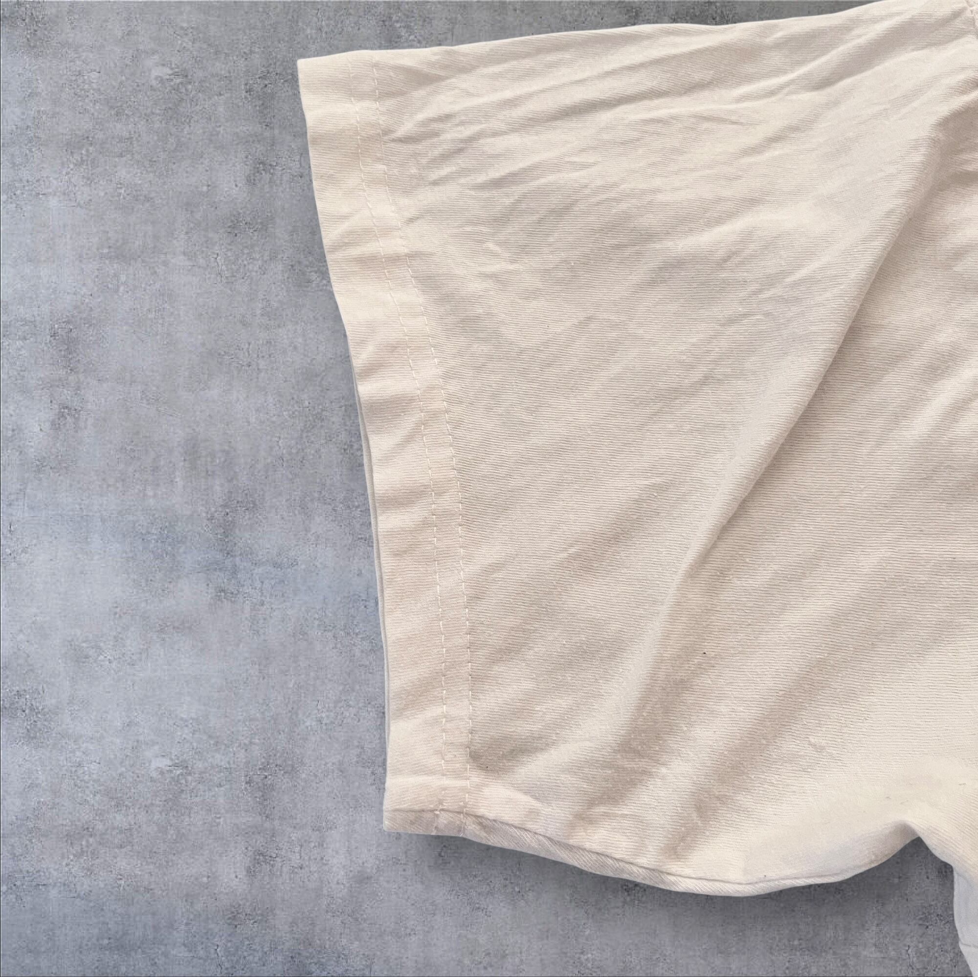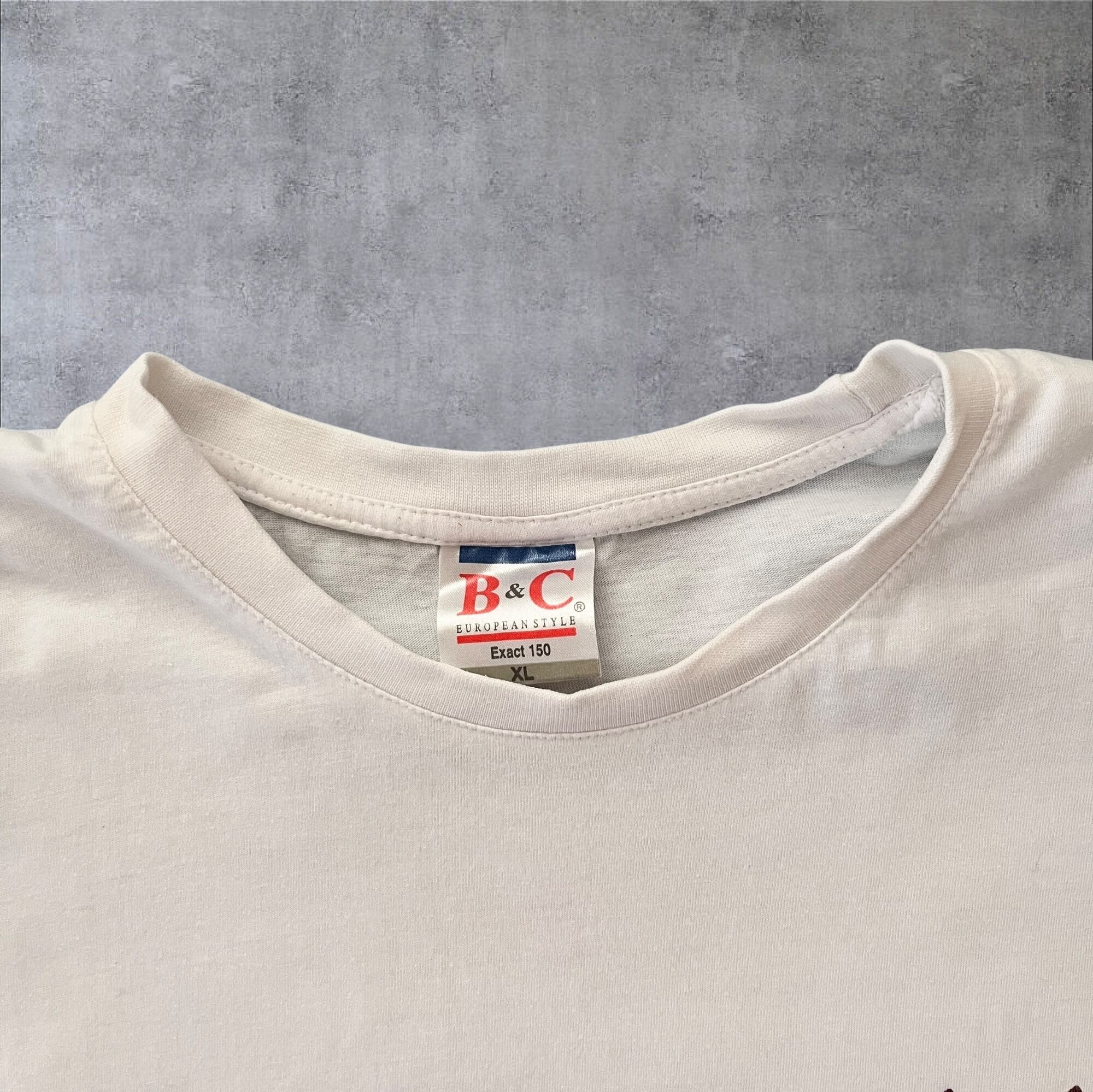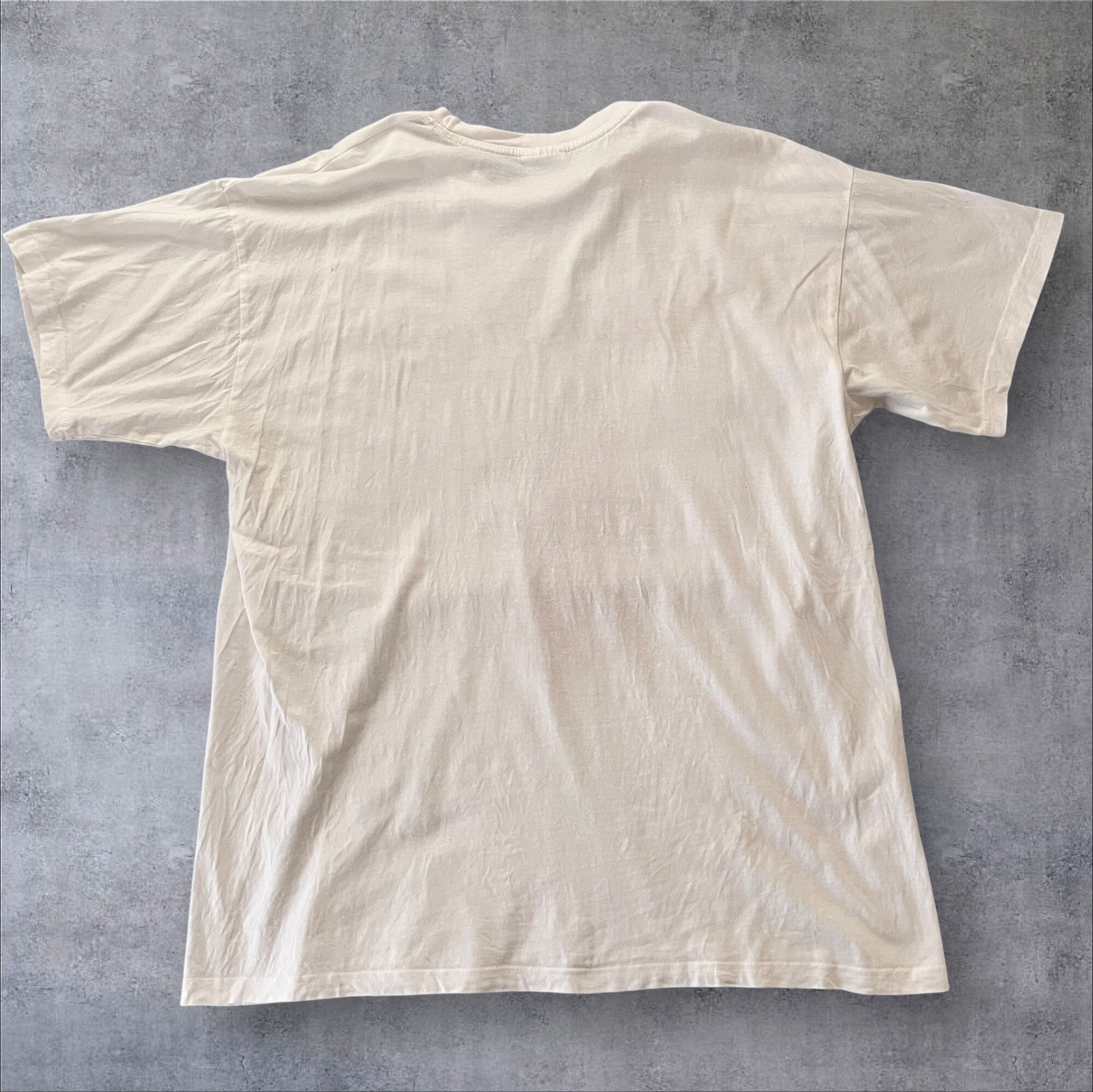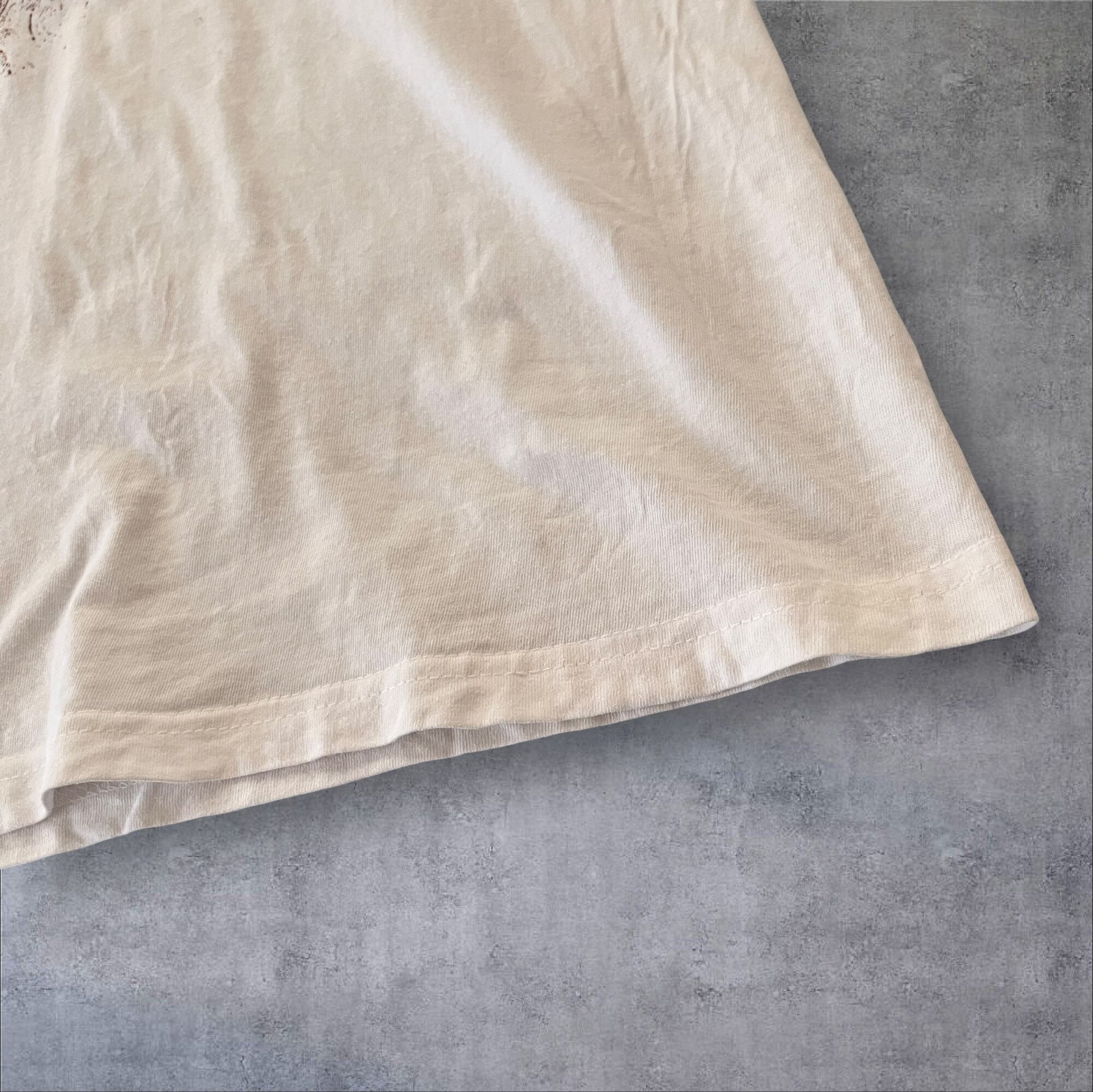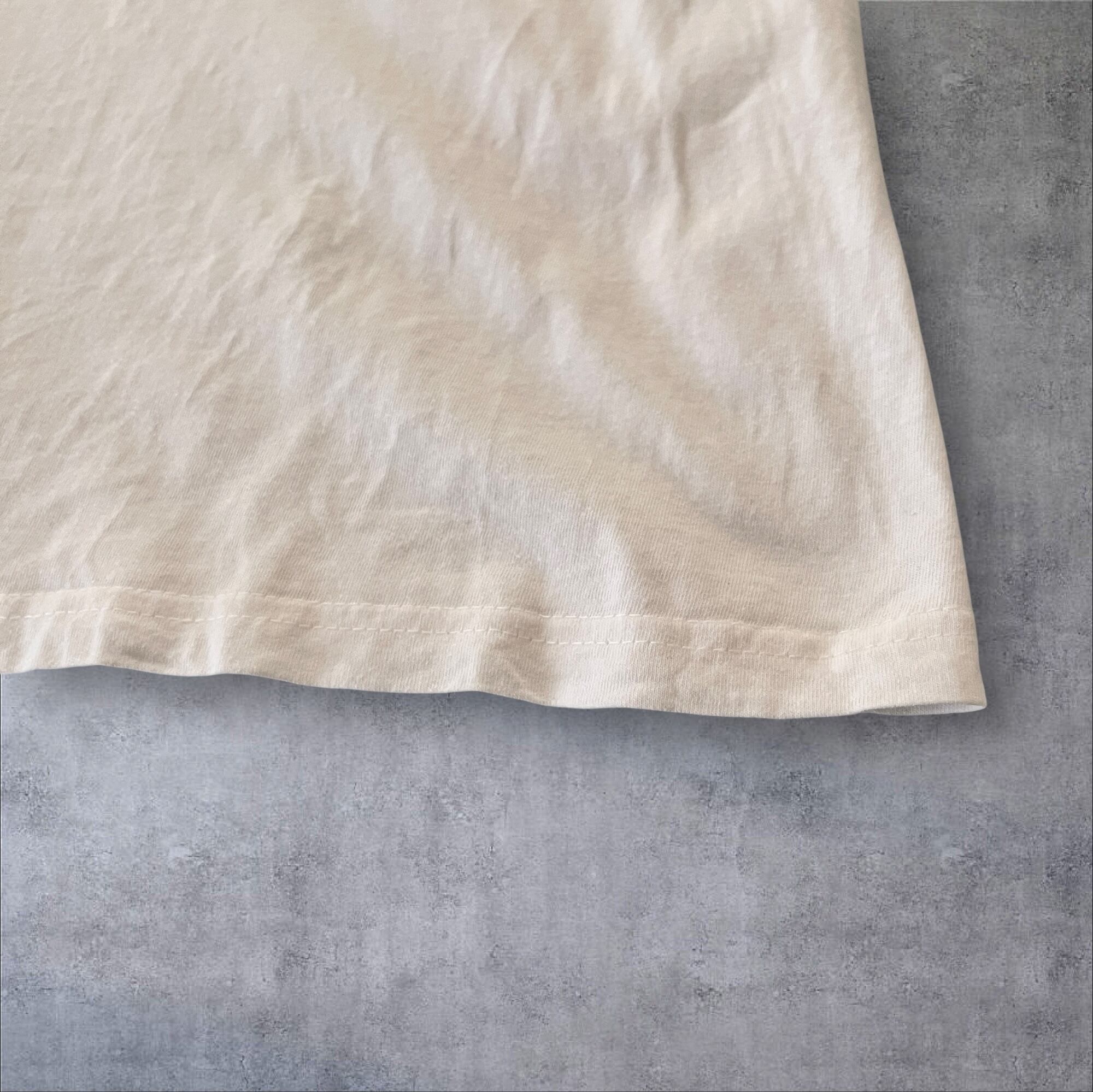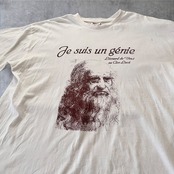 「私は天才です」というフランス語のメッセージとレオナルド・ダ・ヴィンチの肖像がプリントされた、ヨーロッパ製のユニークな一枚です。 ■平置き採寸(cm) 肩幅:55 身幅:56 着丈:71 ■その他特徴 シングルステッチ:無/丸胴:有 ■状態 左肩前あたりピンホールあり