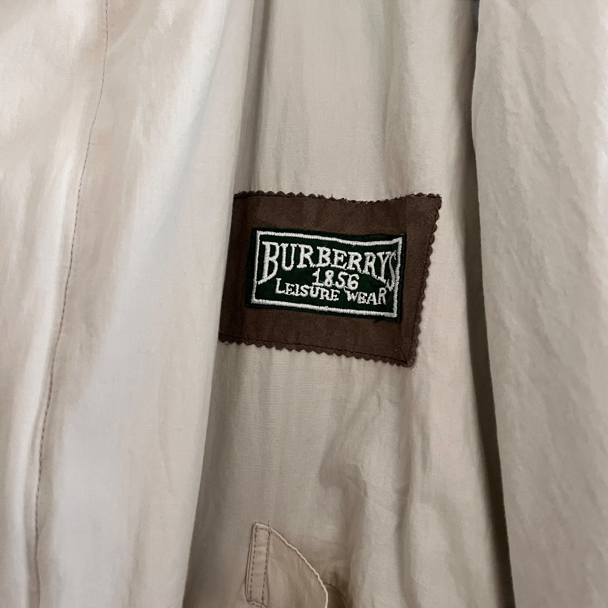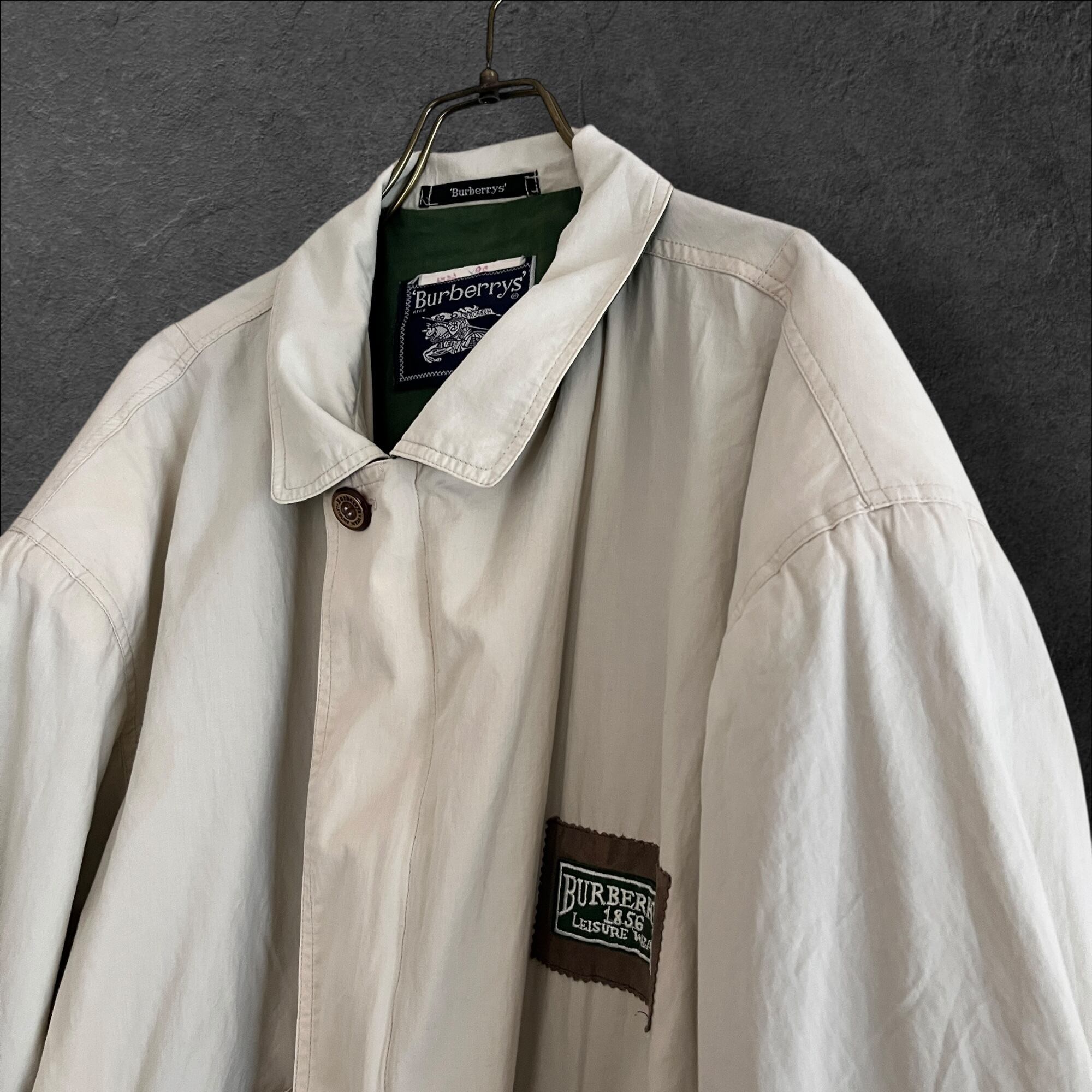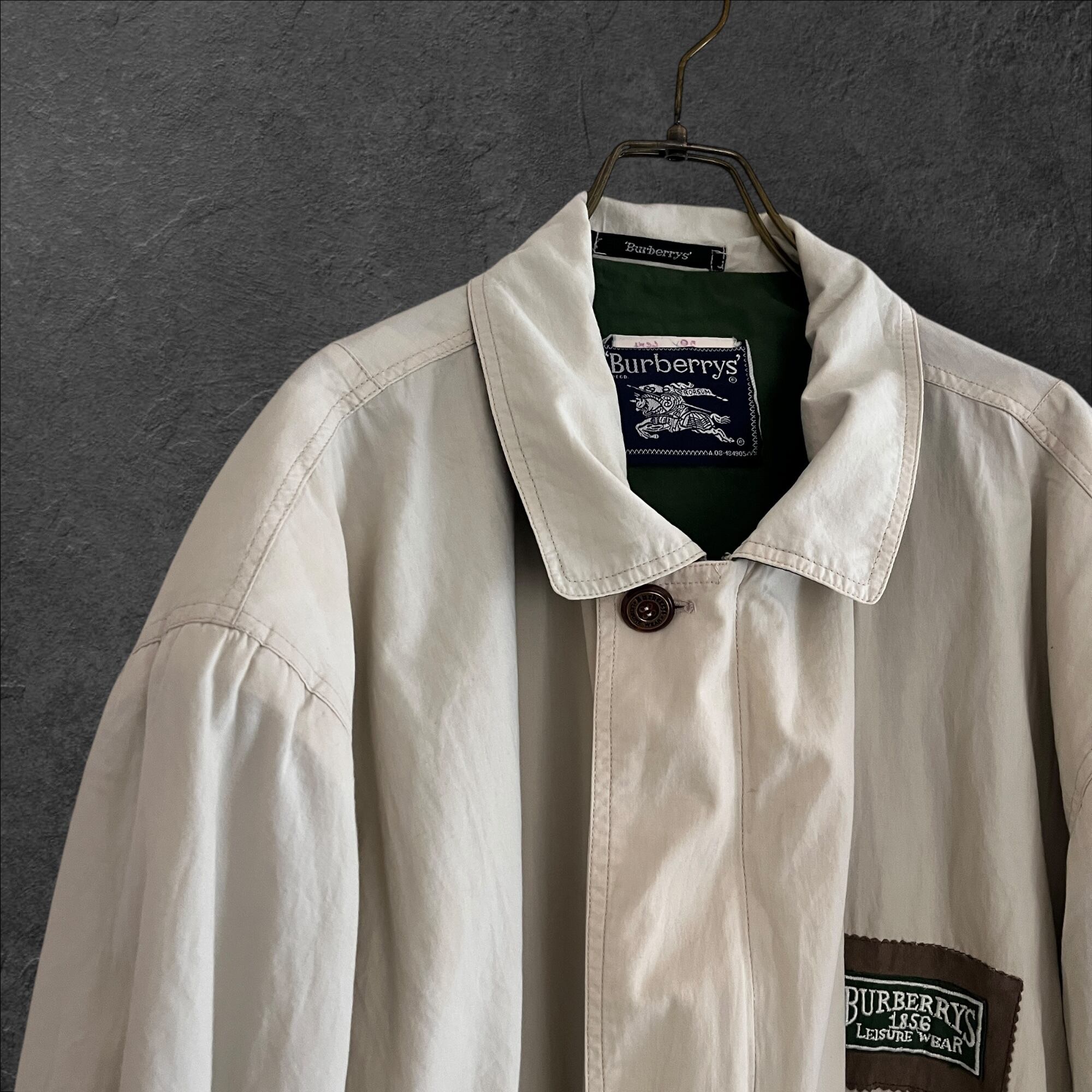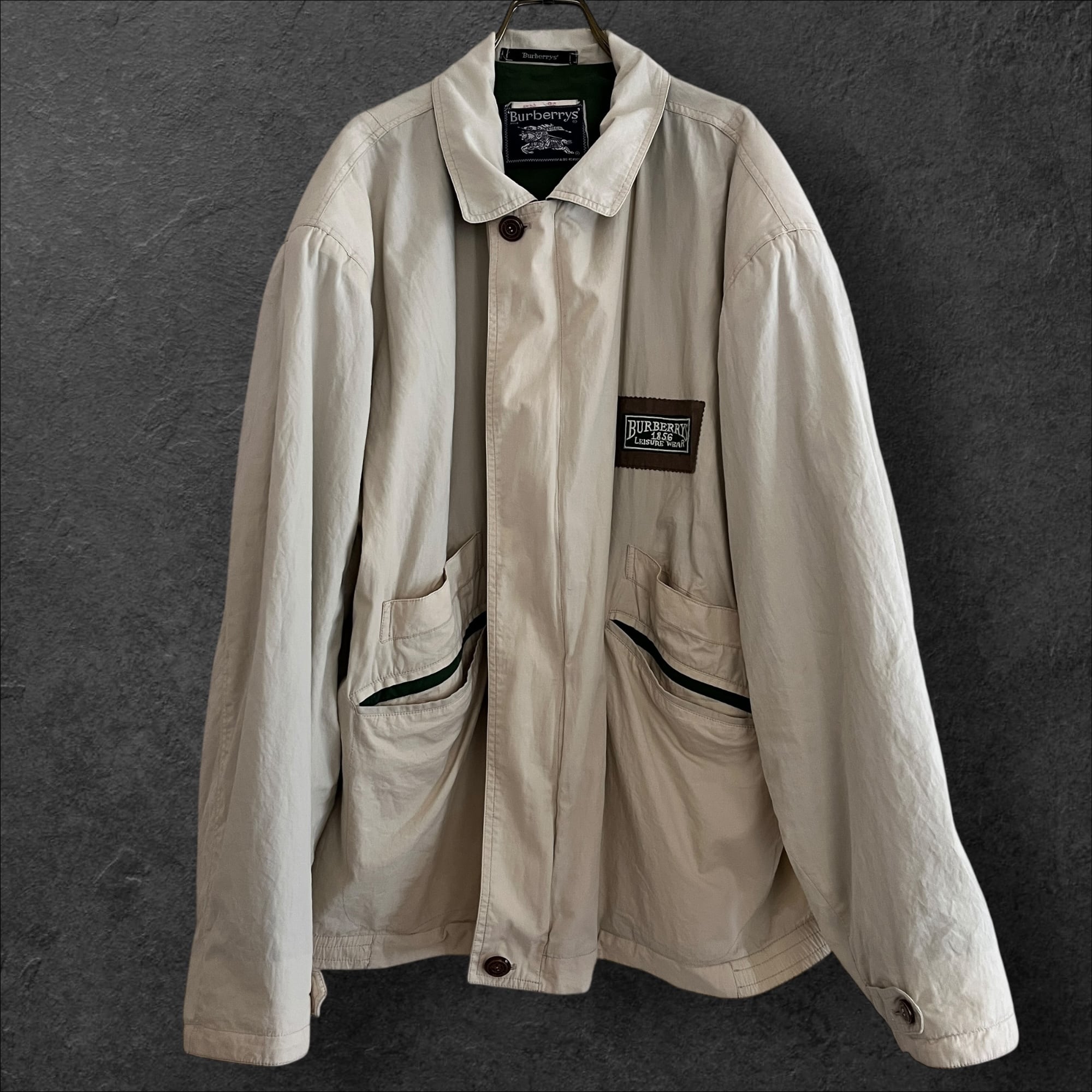 ■説明 Burberrys のヴィンテージジャケット。 生成りの軽いシェルに、グリーンの総裏。胸の “Leisure Wear” ワッペン、背面のブラウン切替、ポケットのグリーンパイピングまで含めて、見た目の完成度が高い一着です。 ■サイズ(cm) 肩幅:58 身幅:70 着丈:69 袖丈:59 ■状態 右ポケット薄シミありですが、ヴィンテージらしい風合いとして楽しめるコンディション。