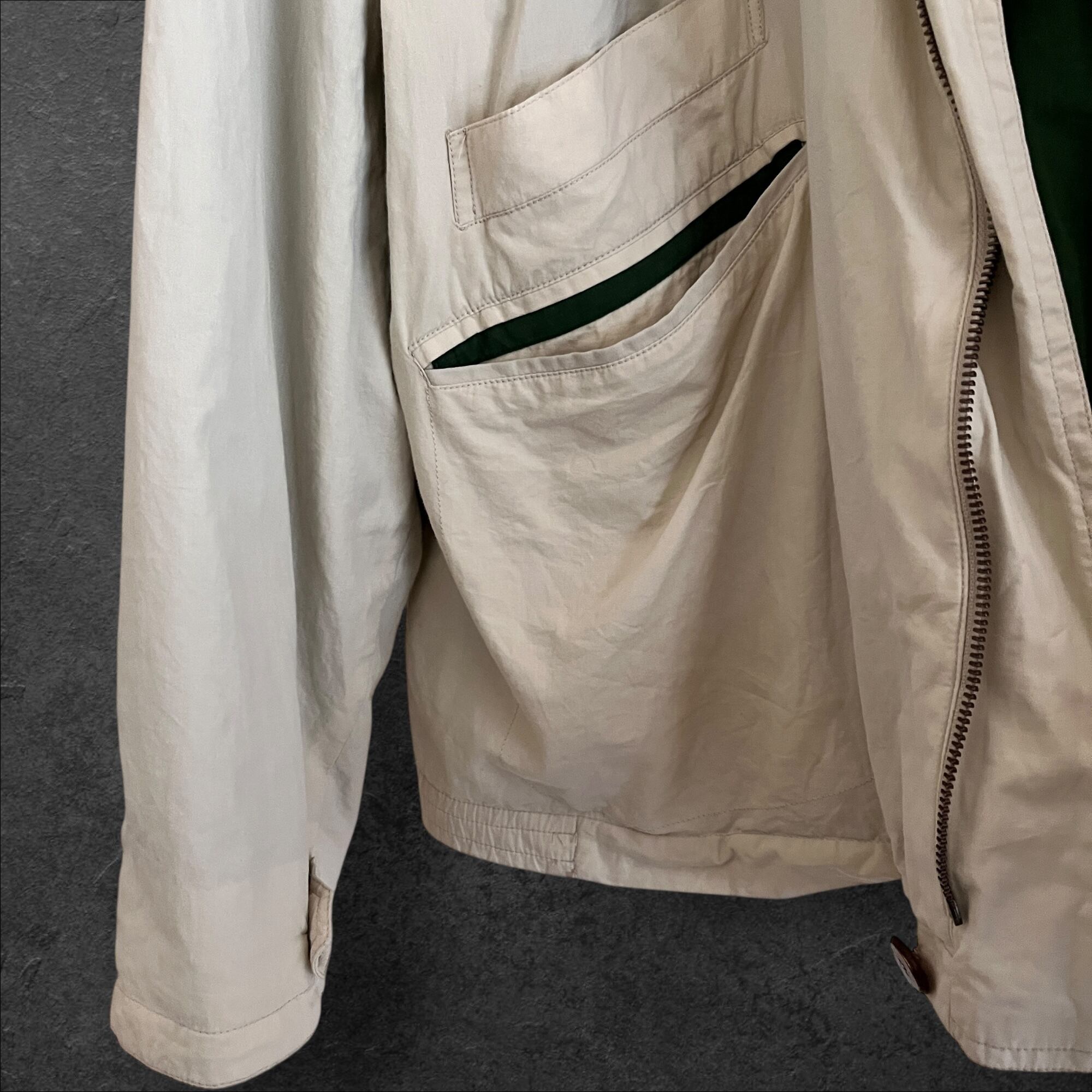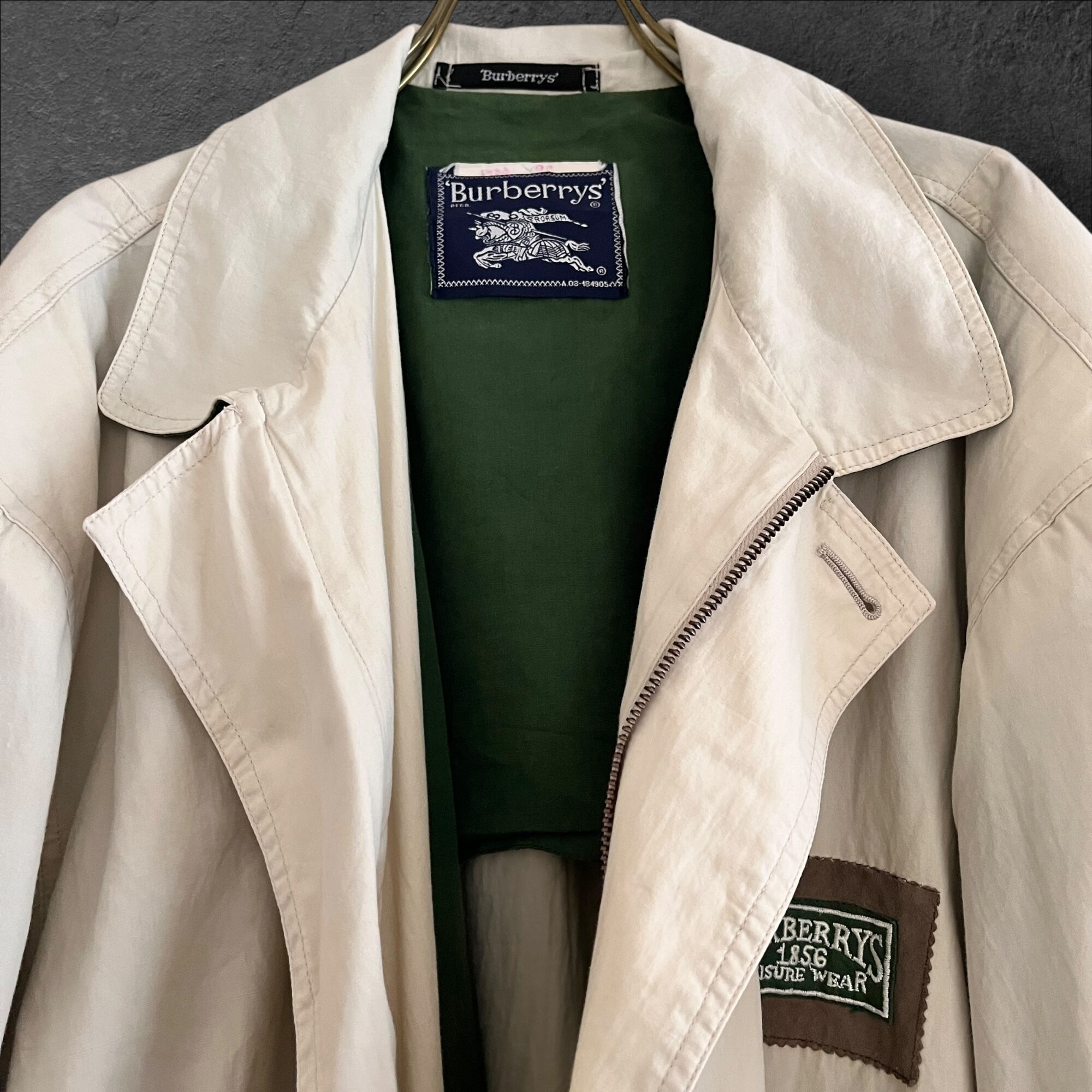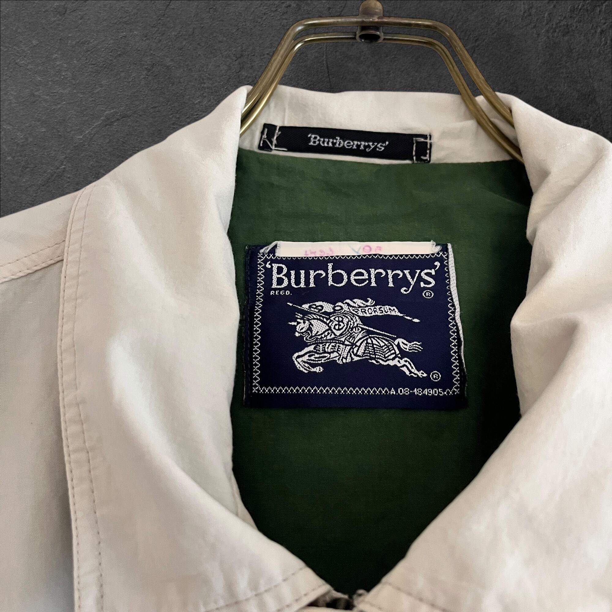 ■説明 Burberrys のヴィンテージジャケット。 生成りの軽いシェルに、グリーンの総裏。胸の “Leisure Wear” ワッペン、背面のブラウン切替、ポケットのグリーンパイピングまで含めて、見た目の完成度が高い一着です。 ■サイズ(cm) 肩幅:58 身幅:70 着丈:69 袖丈:59 ■状態 右ポケット薄シミありですが、ヴィンテージらしい風合いとして楽しめるコンディション。