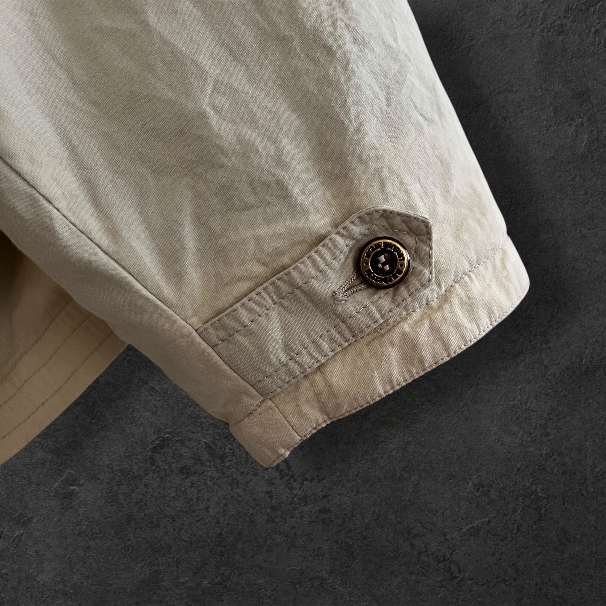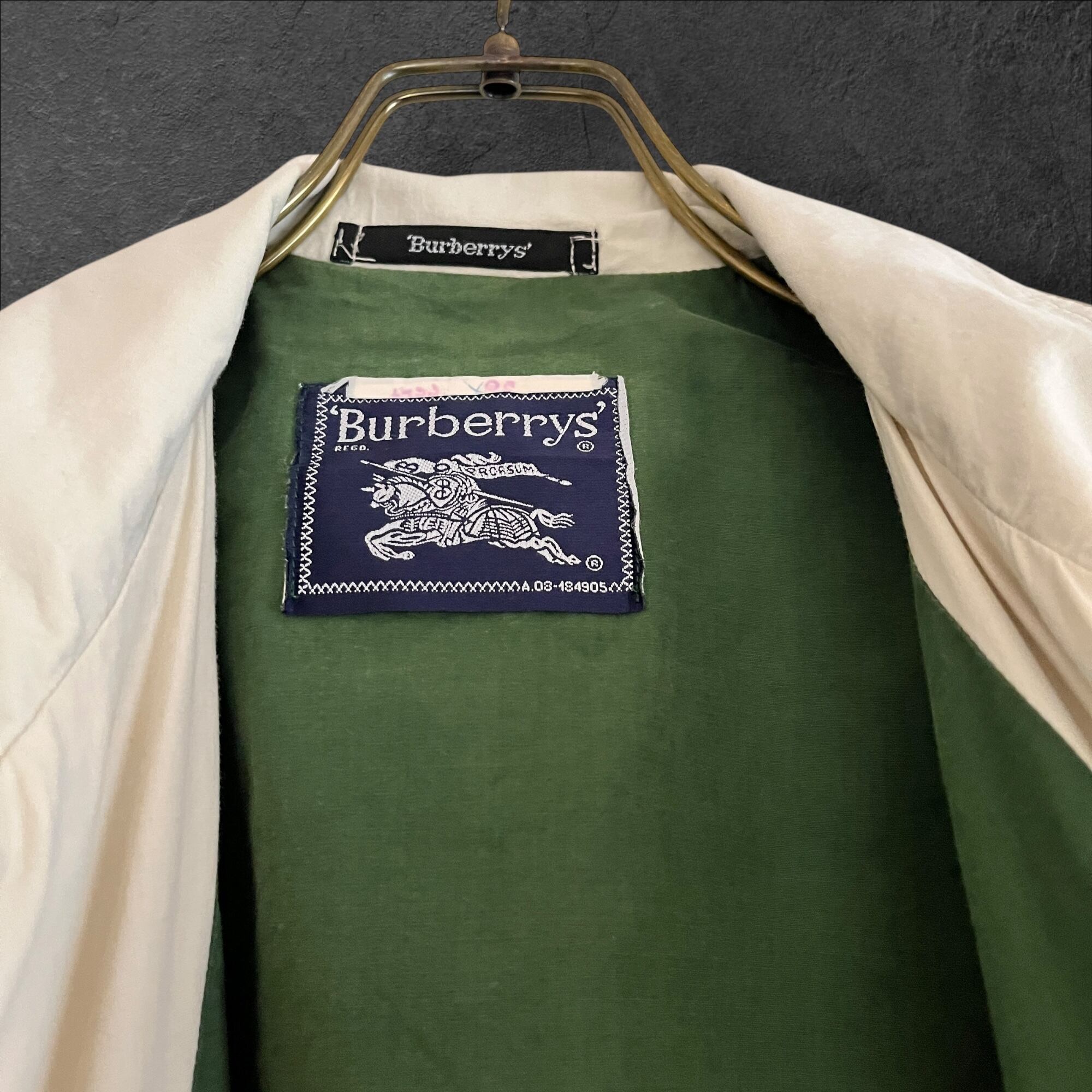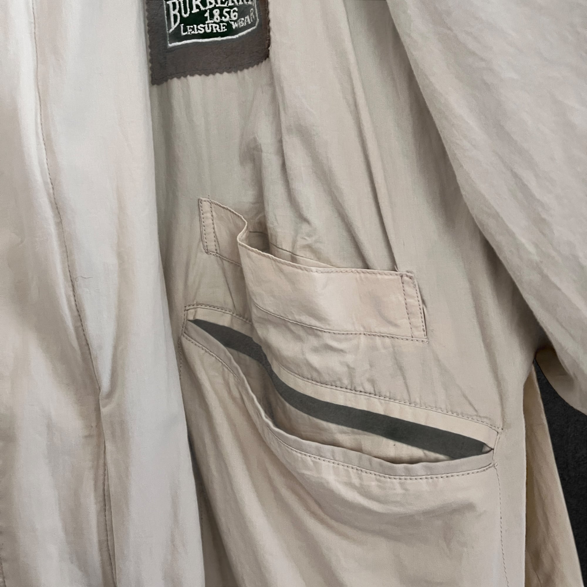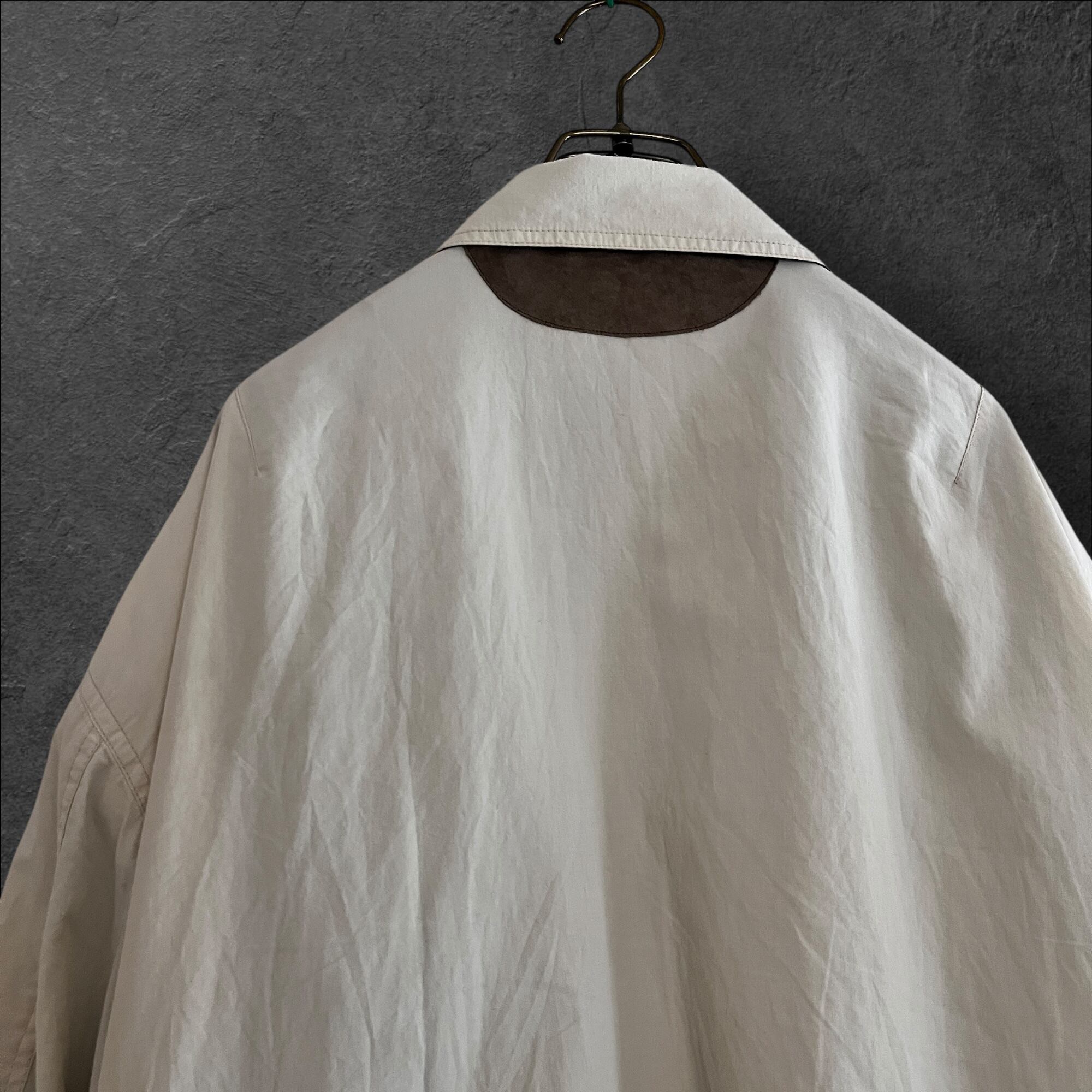 ■説明 Burberrys のヴィンテージジャケット。 生成りの軽いシェルに、グリーンの総裏。胸の “Leisure Wear” ワッペン、背面のブラウン切替、ポケットのグリーンパイピングまで含めて、見た目の完成度が高い一着です。 ■サイズ(cm) 肩幅:58 身幅:70 着丈:69 袖丈:59 ■状態 右ポケット薄シミありですが、ヴィンテージらしい風合いとして楽しめるコンディション。