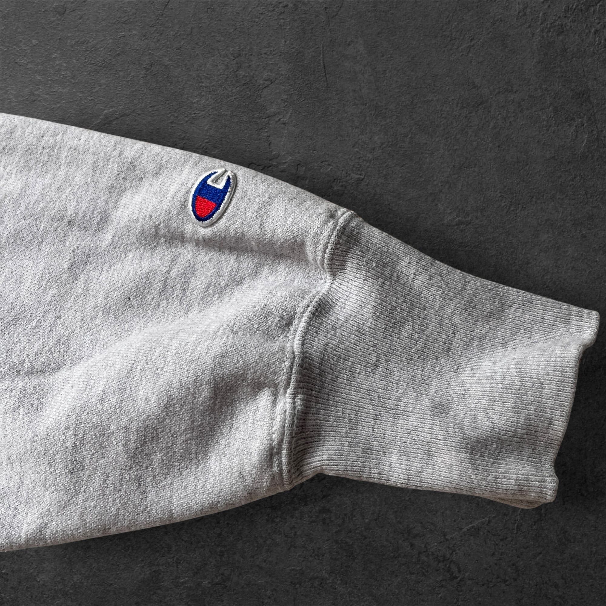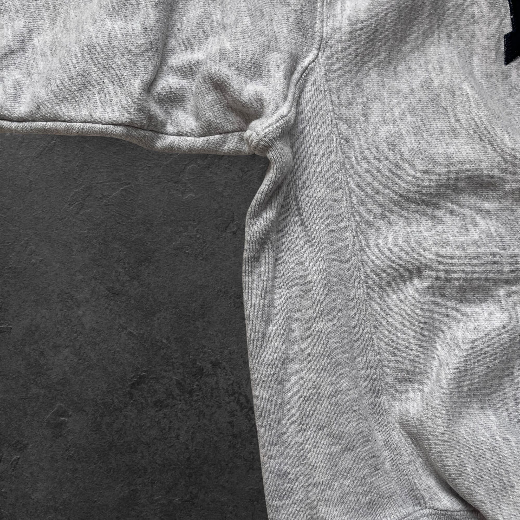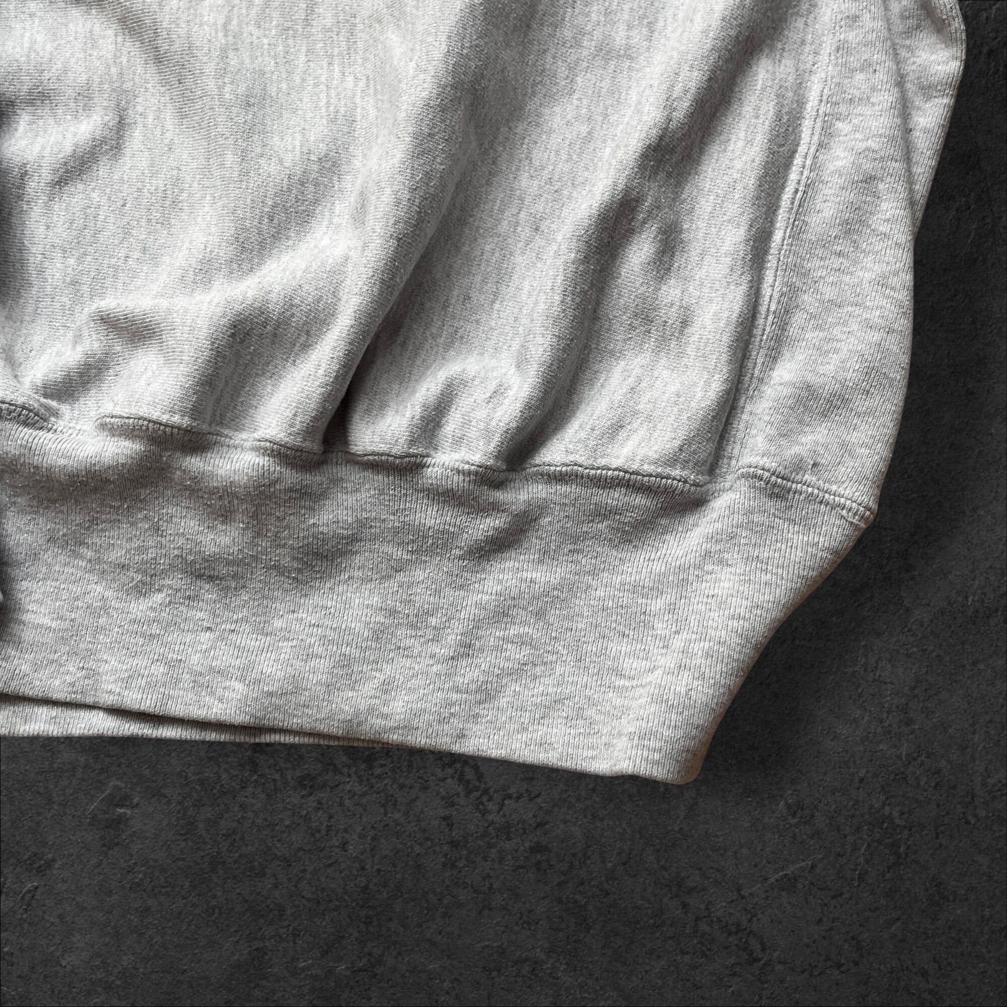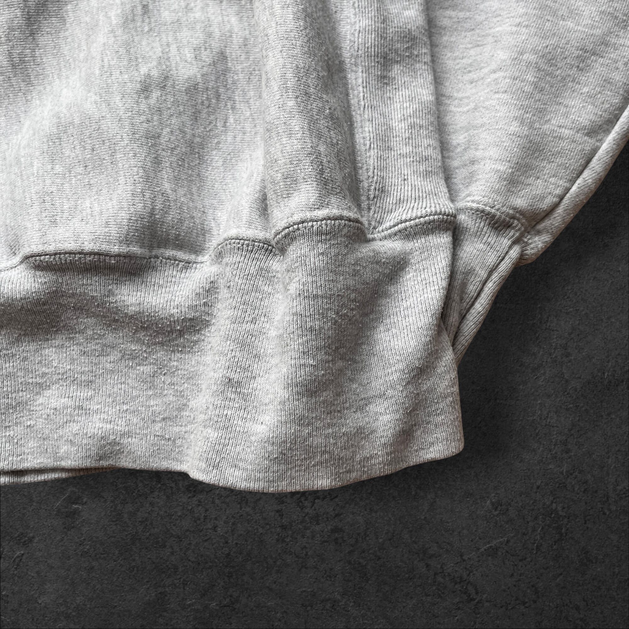 定番のオックスフォードグレーにネイビーのラバープリントが映える、王道のカレッジスウェット。リバースウィーブらしいサイドパネル仕様で、1枚でもインナーでも使いやすいバランスです。